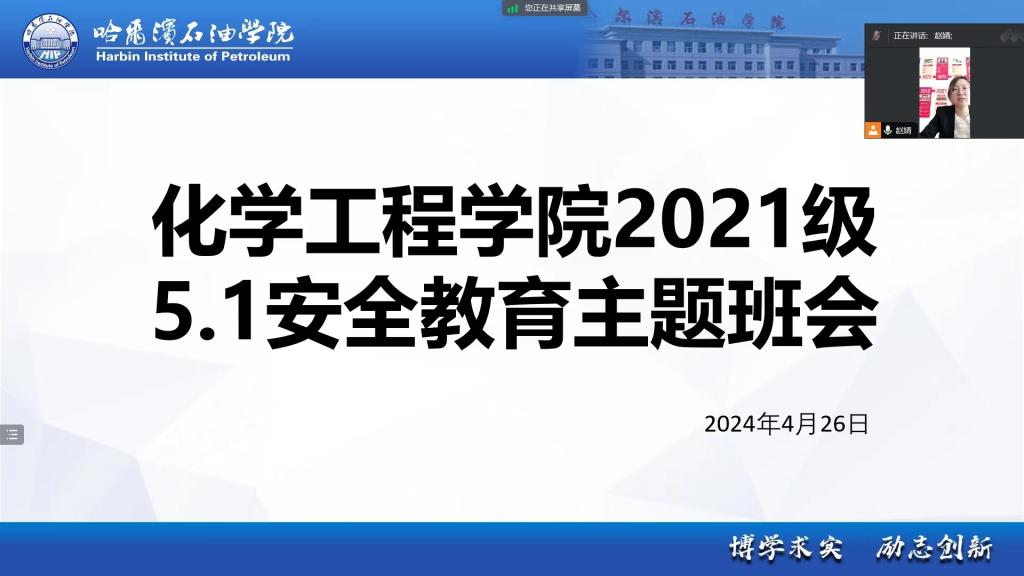 为进一步增强学生们的安全防范意识,提高自我管理的能力,保证学生假期出行安全。2024年4月23日至27日,化学工程学院以线上线下结合的方式召开五一假期安全教育主题班会,会议由各年级辅导员老师主讲,2021级、2022级、2023级全体学生参加。