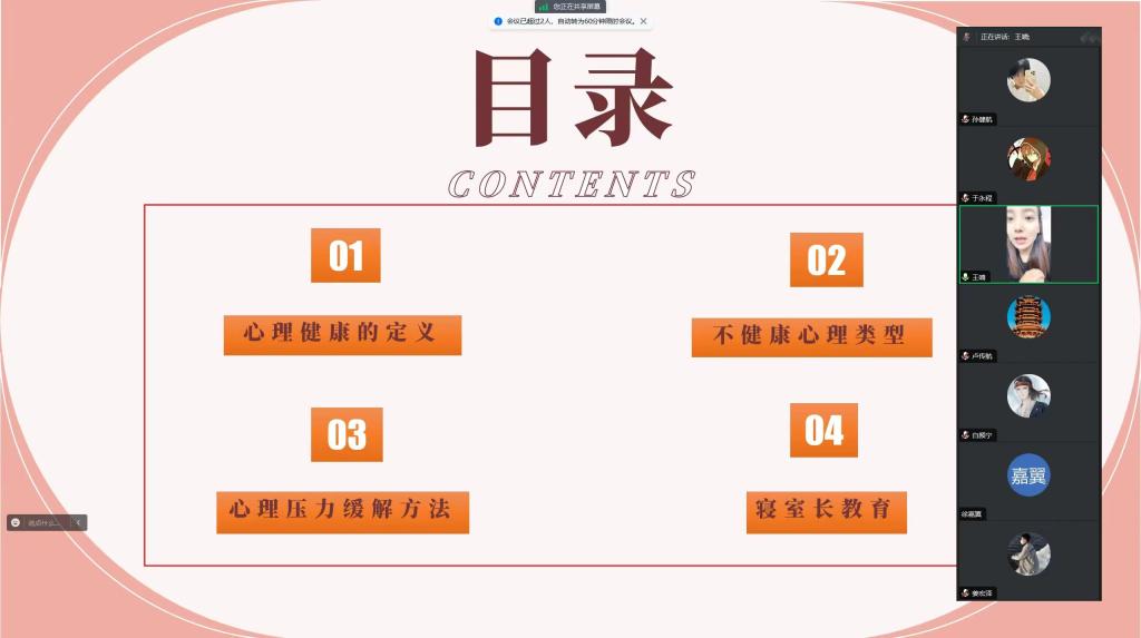 为进一步关注学生心理健康,促进学生全面发展,充分发挥寝室长在宿舍管理中的示范引领和纽带作用。2024年5月22日,化学工程学院于线上开展“悦动心灵 悦纳自我”的大学生心理健康教育。2020级辅导员王喃及2023级全体寝室长参加本次会议。