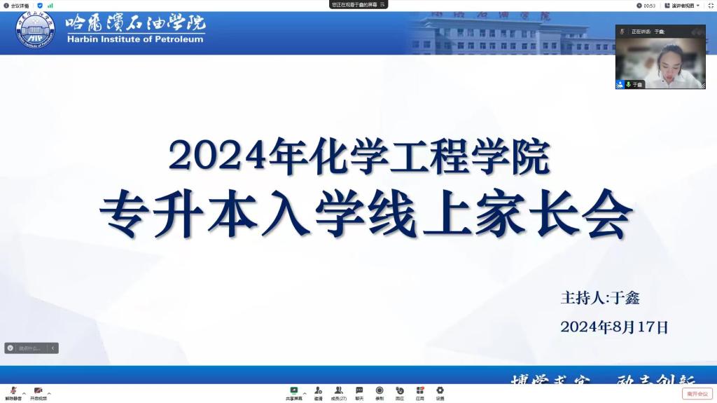 为加强家校间的沟通和交流,让我院2024级专升本新生及家长更好地了解学院专业建设及日常管理事宜。2024年8月17日19时,化学工程学院于腾讯会议召开2024专升本入学线上家长会。本次会议由2024级专升本辅导员于鑫主持,院长杨昕、党总支书记赵婧出席会议,2024级全体专升本新生家长共同参加此次会议。