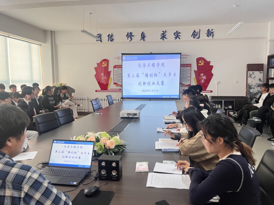 为贯彻落实国务院办公厅《关于深化高等学校创新创业教育改革的实施意见》,进一步提升我院大学生的创新意识和创业能力。根据《冰球突破豪华版官方网站第三届“博创杯”大学生创新创业大赛方案》的要求,化学工程学院于2024年11月12日在学院会议室举办第三届“博创杯”大学生创新创业大赛。前期通过召开教师和学生动员会,学生踊跃报名参加,经过初步评审,共有36个项目进入答辩评审,答辩评审由副院长彭殿宝等6位教师担任评委。