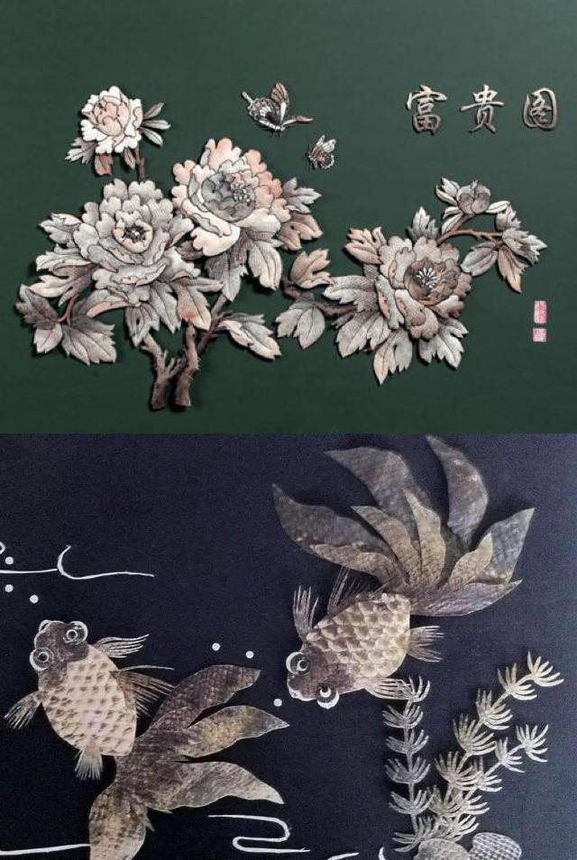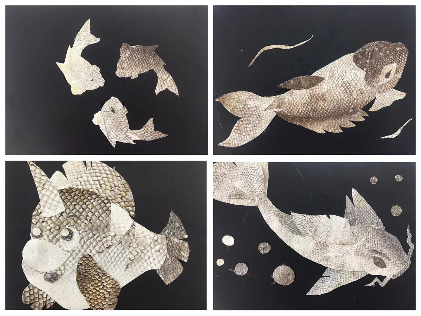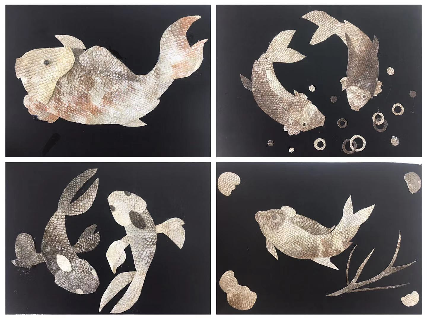 留学生看着这些仿若大自然鬼斧神工的作品,尤其是由鱼皮拼接而成的彩色花鸟图,让在场的许多学生大为惊叹,纷纷讨论并开始制作鱼皮画。