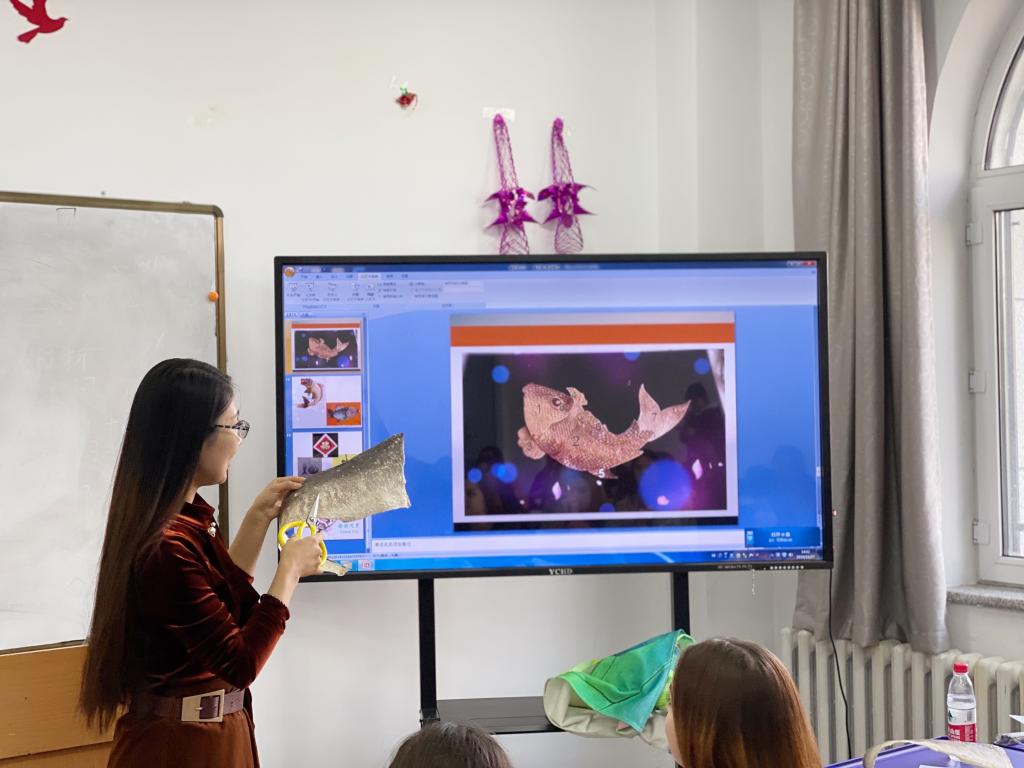 刘芳欣老师首先向各位同学展示了几件鱼皮画作品,然后从鱼皮艺术的起源讲起,以图文并茂的形式,详细介绍了赫哲族的文化历史、鱼皮的种类、鱼皮画制作方法等内容。如:剪画纸、拓印、剪鱼皮、贴画、着色、装裱等。