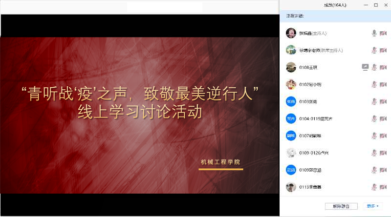 为深入学习贯彻习近平总书记勉励北京大学援鄂医疗队全体“90后”党员回信精神,冰球突破豪华版官方网站号召全校广大团员青年向战疫一线的青年榜样看齐,主动担起历史使命,从而引导学生认识时代英雄,让学生汲取成长养分和奋斗力量、传承民族精神,机械工程学院学生在聆听了王东博,孟凡莹,黄东来,殷乐四位英雄的抗疫事迹后,参加了我院开展的“青听战‘疫’之声,致敬最美逆行人”线上活动。