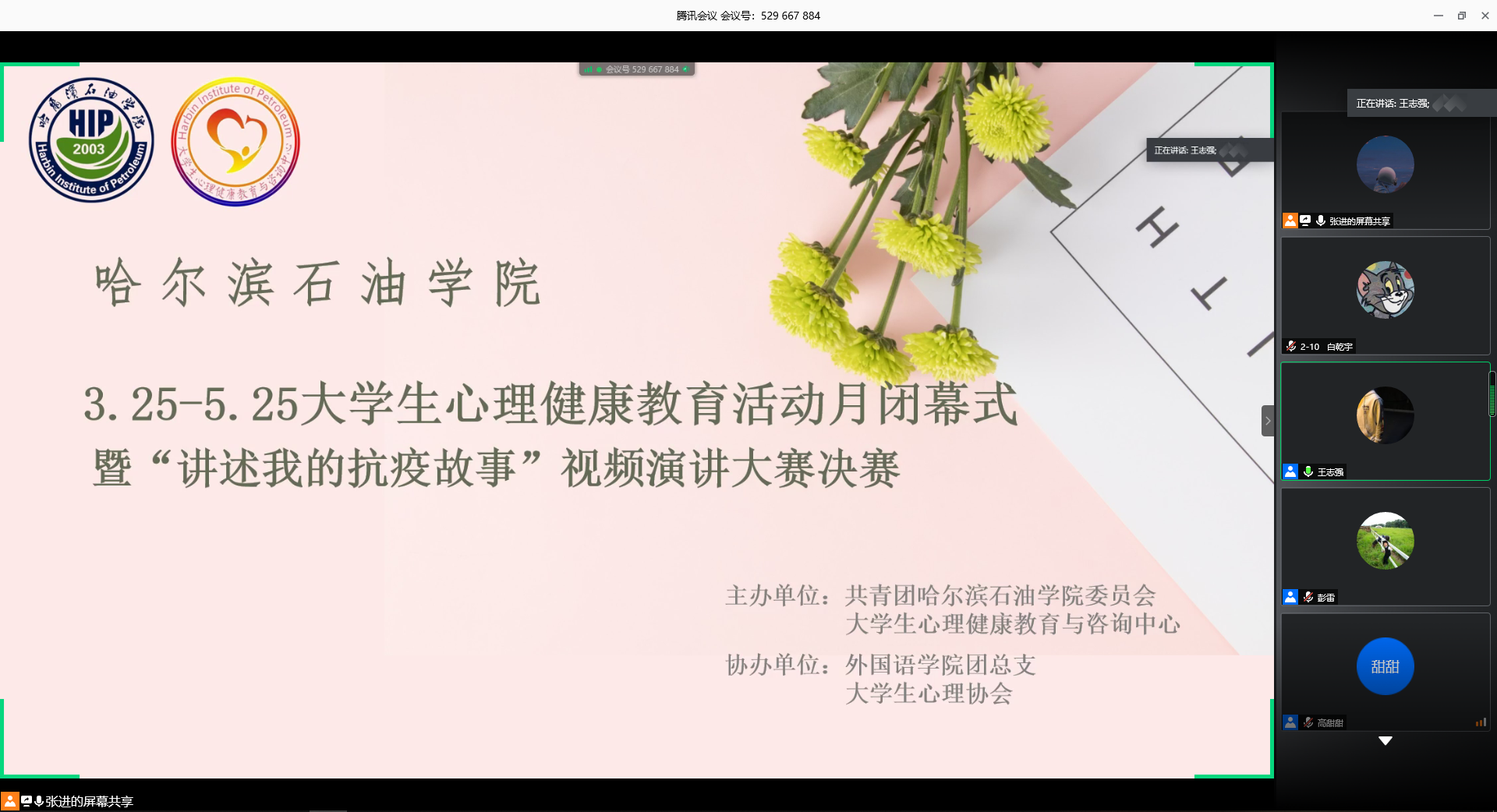 为深入贯彻落实党中央、国务院关于坚决打赢新冠肺炎疫情防控阻击战的决策部署,充分发挥育德与育心相结合的学校心理健康教育工作的重要功能,推动加强冰球官网大学生心理健康教育工作,校团委、学工处大学生心理健康教育与咨询中心决定开展2020年“3.25-5.25大学生心理健康活动月”系列活动。2020年5月25日晚6点冰球突破豪华版官方网站大学生心理健康活动月闭幕式暨“讲述我的抗疫故事”视频演讲大赛决赛顺利在云端举行。冰球突破豪华版官方网站党委副书记、副校长杨宏,学工处处长宁晶,校团委书记王锦石,校团委、大学生心理健康教育与咨询中心全体成员及各二级学院心理工作督导员、团总支书记出席本次活动并担任大赛评委。