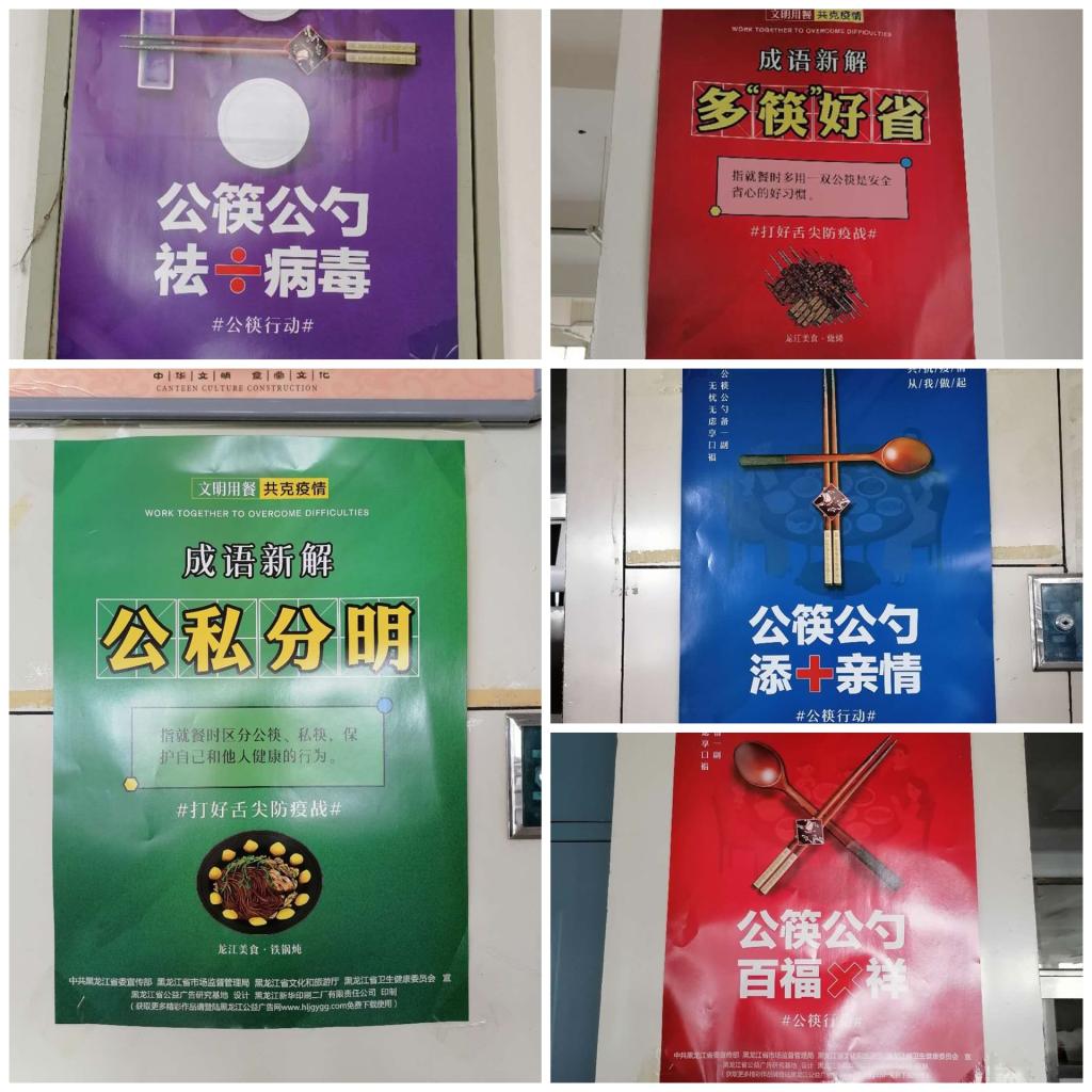 根据学校关于使用“公筷公勺”的倡议,为防范和减少交叉感染及食源性疾病传播,切断“口口相传”的疫情传播途径,后勤处启动了“使用公筷守护舌尖上的安全”行动,同时为学生秋季返校做好准备。通过张贴海报的形式,意在倡导校师生养成使用公勺公筷的良好习惯,健康、卫生、文明的用餐方式。