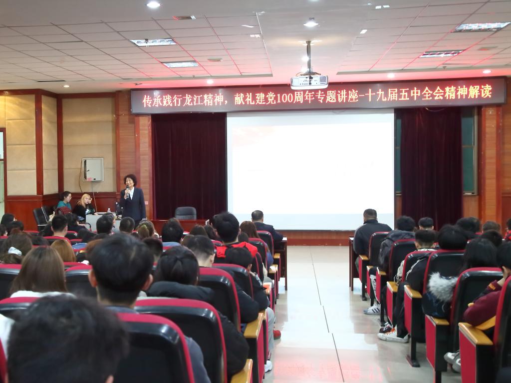 宋玉玲教授以《中国共产党第十九届中央委员会第五次全体会议公报解读》为题,深刻阐述了关于制定国民经济和社会发展第十四个五年规划和二〇三五年远景目标的重大意义,系统解读了“十三五”规划目标任务即将完成、“十四五”经济社会发展主要目标、中国共产党一以贯之追求现代化、习近平总书记建设社会主义现代化的新思想新观点新要求、二〇三五年远景目标的内容、中国现代化同西方发达国家的不同、中国实现现代化是人类历史上前所未有的大变革等方面的主要内容,为哈油师生全面、系统、准确、深入地宣讲了党的十九届五中全会公报。