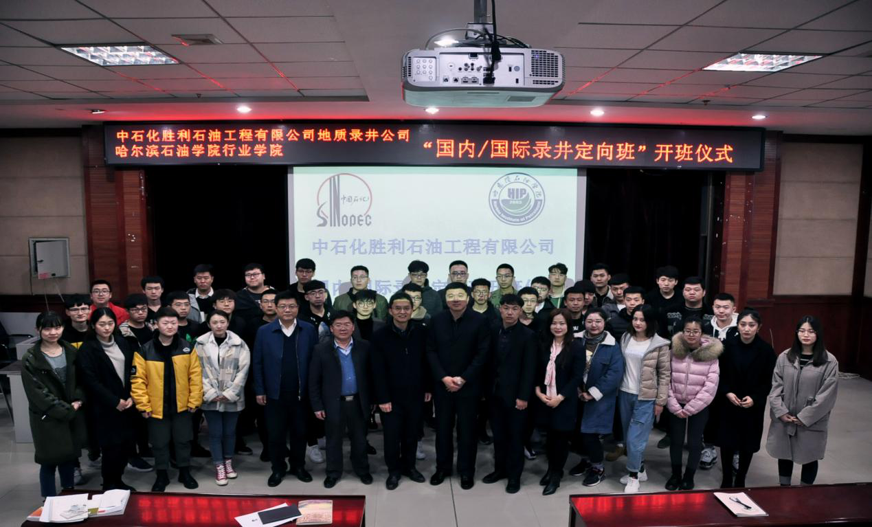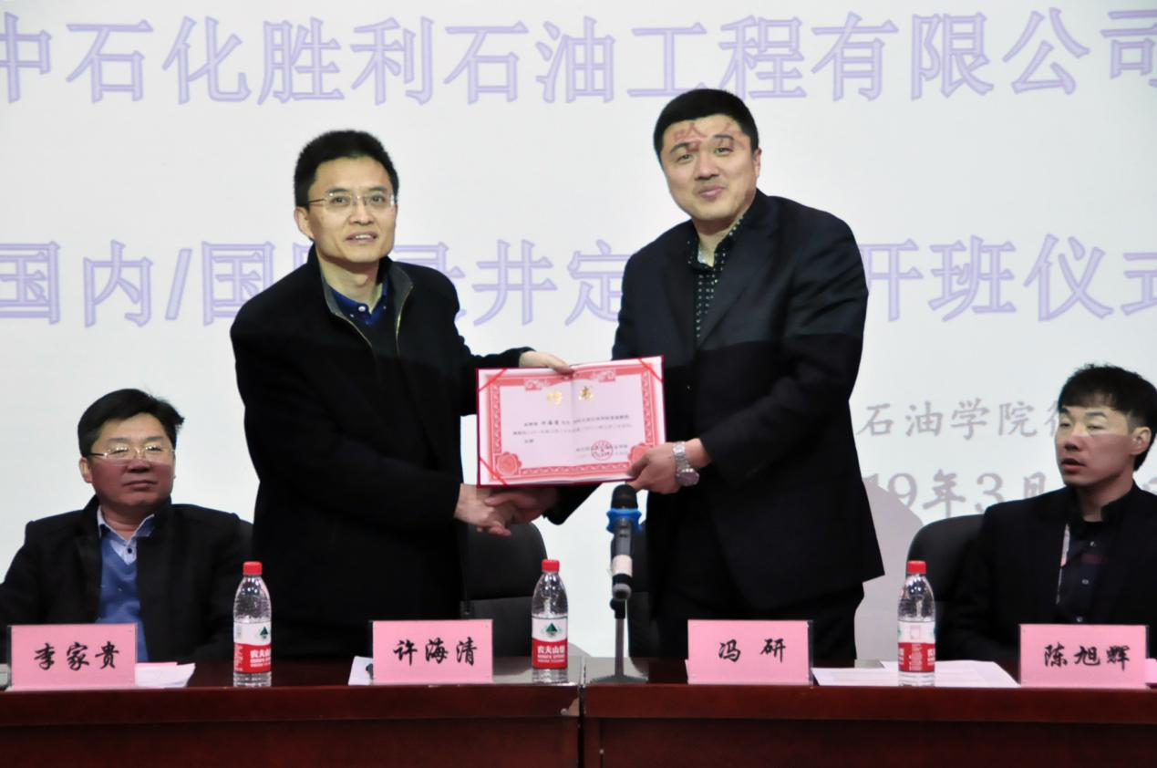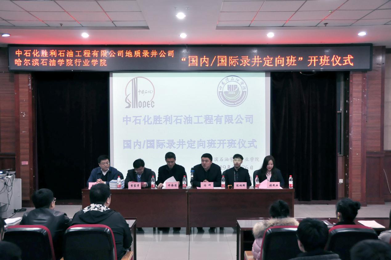 2019年3月26日10:00在主楼518报告厅,中石化胜利石油工程有限公司地质录井公司与冰球突破豪华版官方网站行业学院召开“录井定向班开班仪式”,中石化胜利石油工程有限公司地质录井公司副经理许海清、副总经济师兼人力资源科科长、党委组织科科长徐刚、公司技术顾问李家贵,冰球突破豪华版官方网站冯研副校长、行业学院张艳丛院长、就业办陈旭辉主任及定向班同学出席活动。