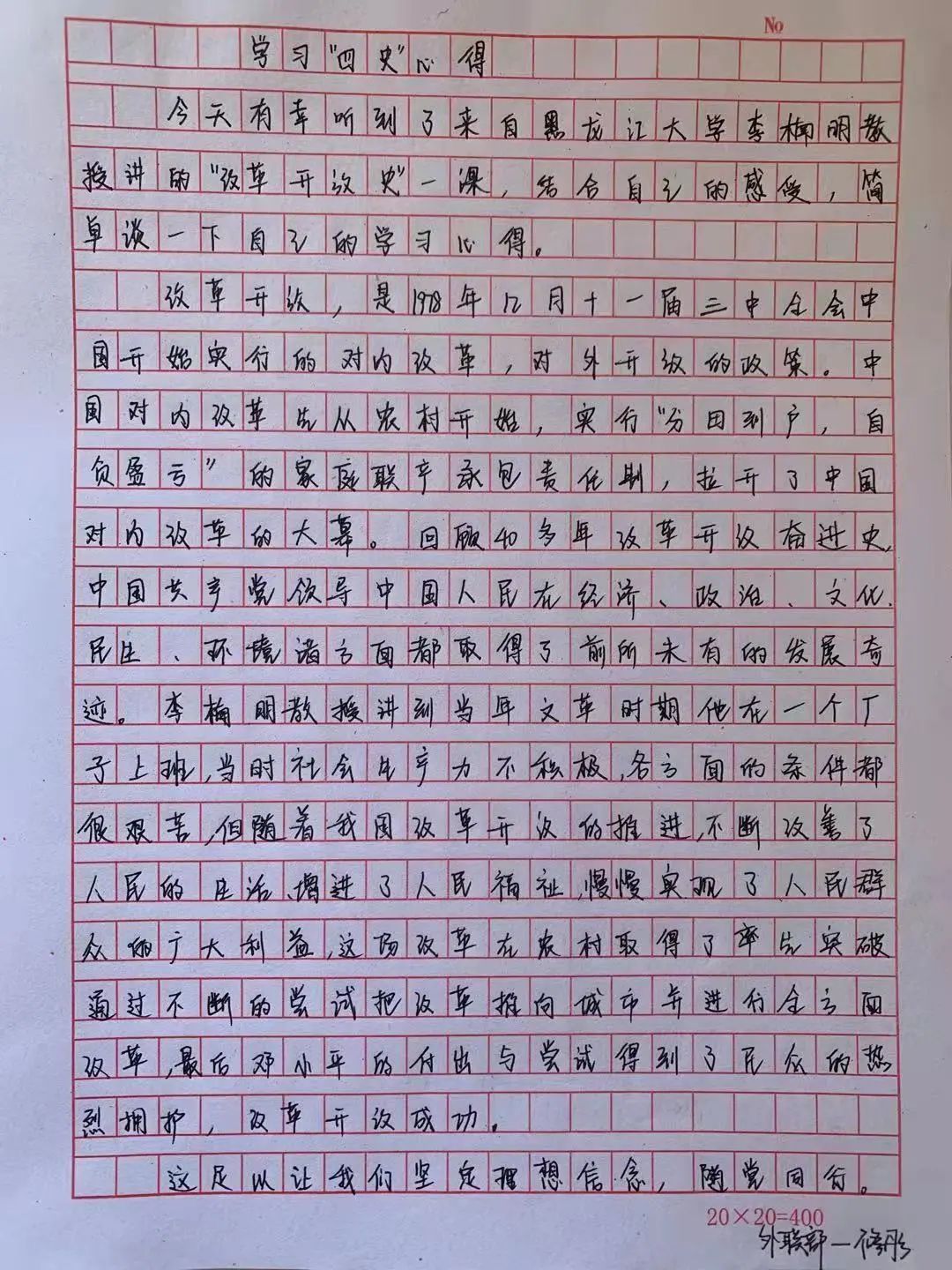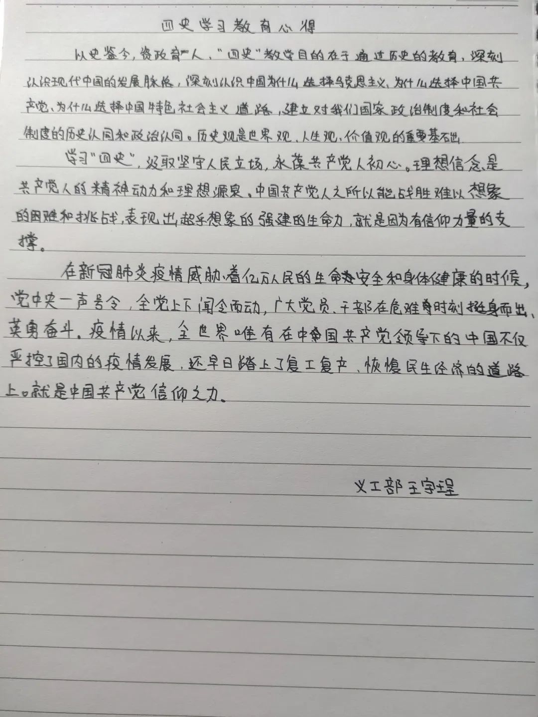 直播中同学们了解了我党创立以来、新中国成立来以及改革开放以来的重大事件、重要会议、重要文件、重要人物,以及我们党领导人民进行的艰苦卓绝的斗争历程,同时大家还了解了中国近代以来的斗争史及我党的光荣传统、宝贵经验和伟大成就。同学们学习过程中深刻了解了“四史”,学习后一一诉说感悟,写下心得。