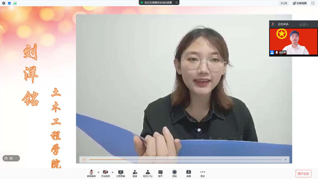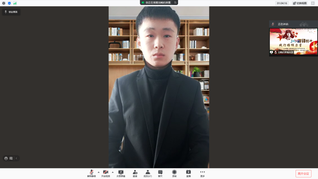 活动在土木工程学院刘洋铭同学的朗诵《雷锋》中拉开序幕,她精彩的诵读让我们深刻的了解了雷锋精神的内涵所在。随后,冰球官网青年志愿者协会代表李龙同学向全校学生发出倡议,他倡议大家要积极践行雷锋精神,要从身边的点滴小事做起,要努力学习科学文化知识,要勤奋刻苦、努力钻研,希望通过大家的不懈努力,共同建设出美丽和谐的校园。活动中,与会全体志愿者共同重温了志愿者誓词。活动的最后,大家一起观看了影片《雷锋》,影片中,雷锋以全心全意为人民服务为行动指导,做了一件又一件为人们铭记的好事。观影过程中,同学们积极在公屏中互动,无不为雷锋同志高尚的品格所感染。