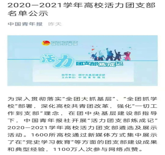 近日,中国青年报公布2020-2021学年高校活力团支部公示名单,冰球突破豪华版官方网站经济管理学院2019级市场营销专业三班团支部光荣入选公示名单,彰显了冰球官网在深入开展高校共青团改革的突出成就。