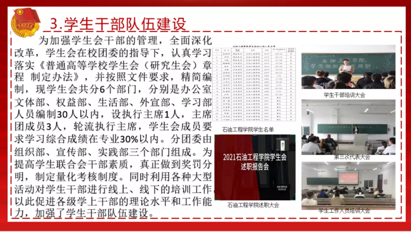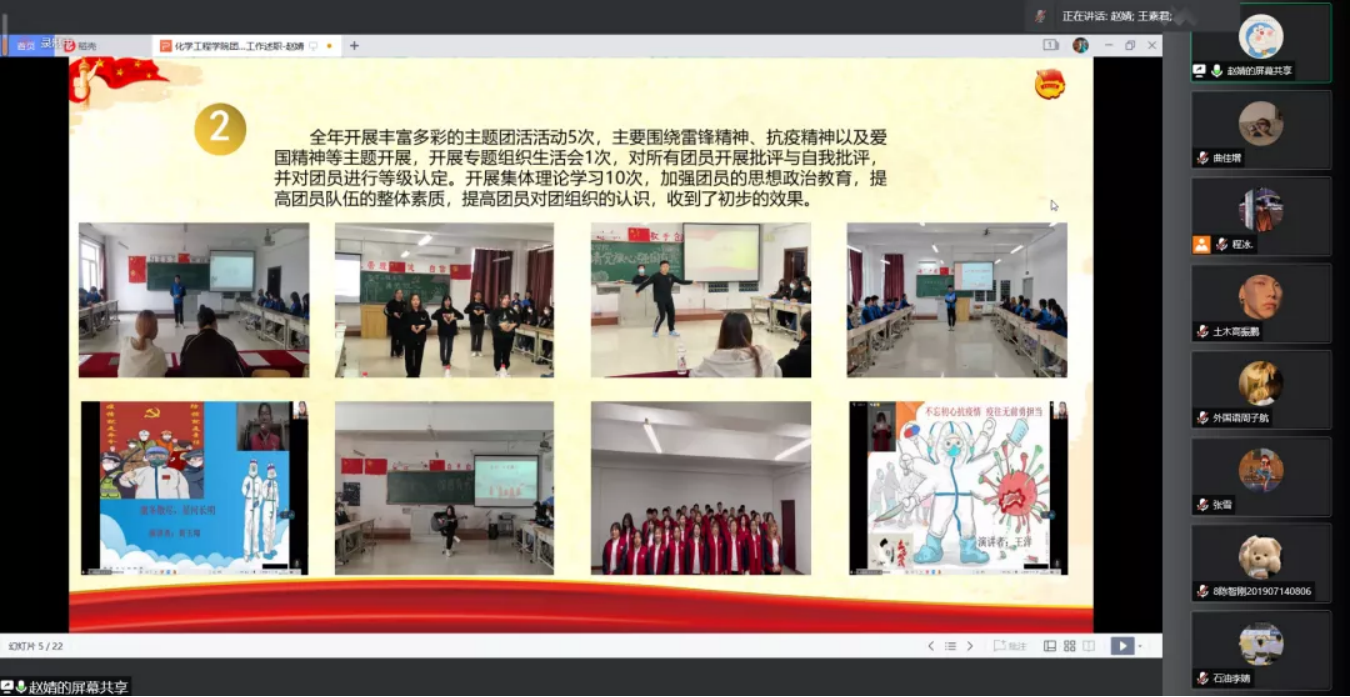 会上,各学院团总支书记围绕2021年学校共青团工作,分别从思想引领、组织建设、日常工作、第二课堂(社团)活动、创新创业、社会实践、志愿服务(公益活动)、学生组织建设、就业指导工作、全媒体建设、获奖情况等多方面进行述职,通过列数据、举实例、谈作为、点问题,总结工作成效、介绍工作品牌、分享工作经验,充分展示了一年来各学院共青团工作取得的显著成效。