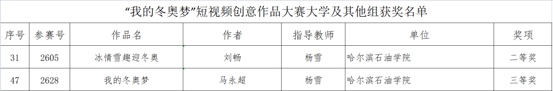近日,由黑龙江广播电视台联合黑龙江省教育厅、黑龙江省体育局、共青团黑龙江省委发起的“我的冬奥梦”短视频创意作品大赛获奖名单出炉,经过激烈角逐,冰球官网2019级艺术与教育学院学生刘畅作品“冰情雪趣迎冬奥”荣获二等奖,2019级石油工程学院学生马永超作品“我的冬奥梦”荣获三等奖。