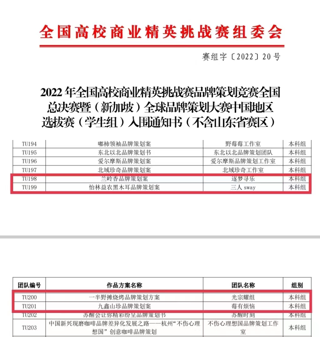 近日,2022年全国高校商业精英挑战赛品牌策划竞赛传来佳音,冰球突破豪华版官方网站经济管理学院4支代表队历经数月的努力成功入围全国总决赛,成绩在黑龙江省同类高校中居于前列,成绩喜人!