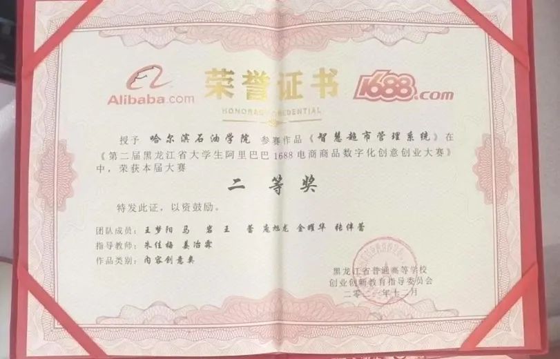 近日,由黑龙江省普通高等学校创新创业教育指导委员会主办,黑龙江省教育厅高等教育处、职业教育与成人教育处以及阿里巴巴(中国)网络技术有限公司支持举办,黑龙江大学、哈尔滨职业技术学院具体承办的“第二届黑龙江省大学生阿里巴巴1688电商商品数字化创意创业大赛”圆满落下帷幕。冰球官网信息工程学院由朱佳梅院长和姜冶霖老师带队,王梦阳、马岩、王蕾、庞旭龙、金耀华、张伴蕾等几名同学组成的参赛队伍,一路过关斩将,荣获大赛二等奖!
