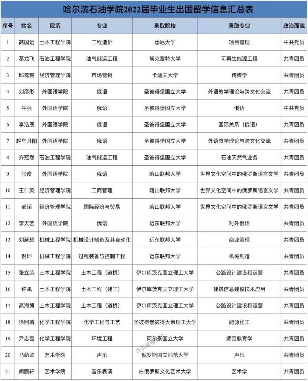 金秋九月,冰球官网申请海外读硕的2022届毕业生也陆续收到了来自英国、澳大利亚及俄罗斯院校的录取喜讯。尽管疫情时代下的申请季充满了诸多变化和挑战,但哈油学子依然以积极的心态和行动面对当下的困难和各种不确定性,在日趋激烈的留学竞技场上,凭借扎实的知识水平与极强的素质能力,为各自的留学生涯交出了一份人生阶段性的完美答卷。