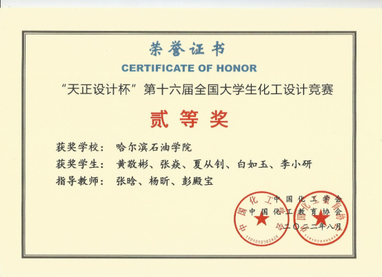 由中国化工学会、中国化工教育协会主办的2022年“天正设计杯”第十六届全国大学生化工设计竞赛于8月22日落下帷幕。冰球官网化学工程学院学生黄敬彬、张焱、夏从钊、白如玉、李小研组成的BDO三分甜团队(指导教师张晗、杨昕、彭殿宝)荣获全国二等奖,成绩喜人。