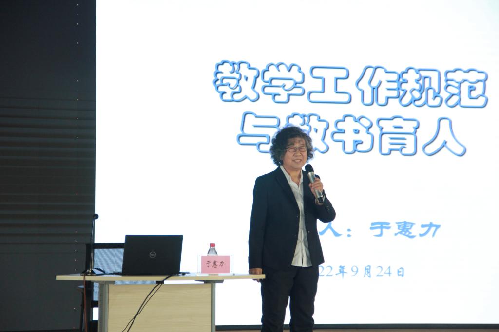 校总督学于惠力教授进行了题为“教学工作规范与教书育人”的专题讲座。于教授结合几十年的教学经验,分别从备课方法、课堂讲授方法及技巧、教学环节介绍、教书育人四个方面为大家进行了认真细致的讲解,她通过举实例、归纳总结等形式进行生动、易懂的讲授。78岁,一个半小时,全程站立,精神饱满,声音洪亮,没喝一口水,于教授的敬业精神也感染和感动着每一位新教师。