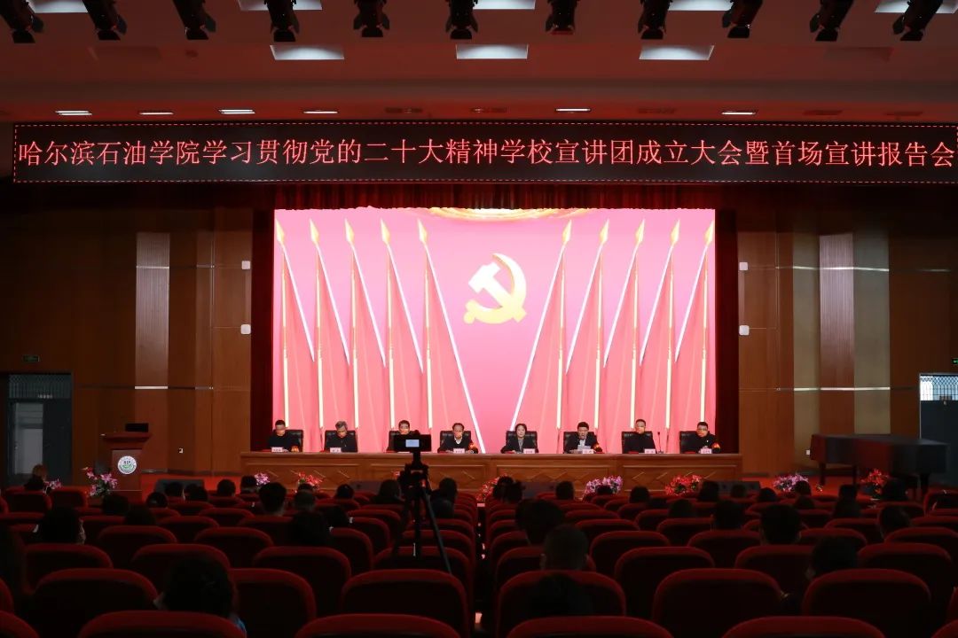 宣讲会采取线上、线下相结合的方式进行。全体校领导、学习贯彻党的二十大精神学校宣讲团成员、各党总支书记、总支委员、各党支部书记、支部委员、各部门主要负责人、学生党员代表、学生干部代表参加大会。