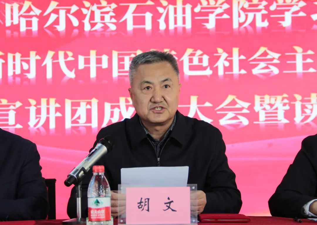 副校长胡文宣读《关于成立冰球突破豪华版官方网站学习贯彻习近平新时代中国特色社会主义思想主题教育理论宣讲团的决定》