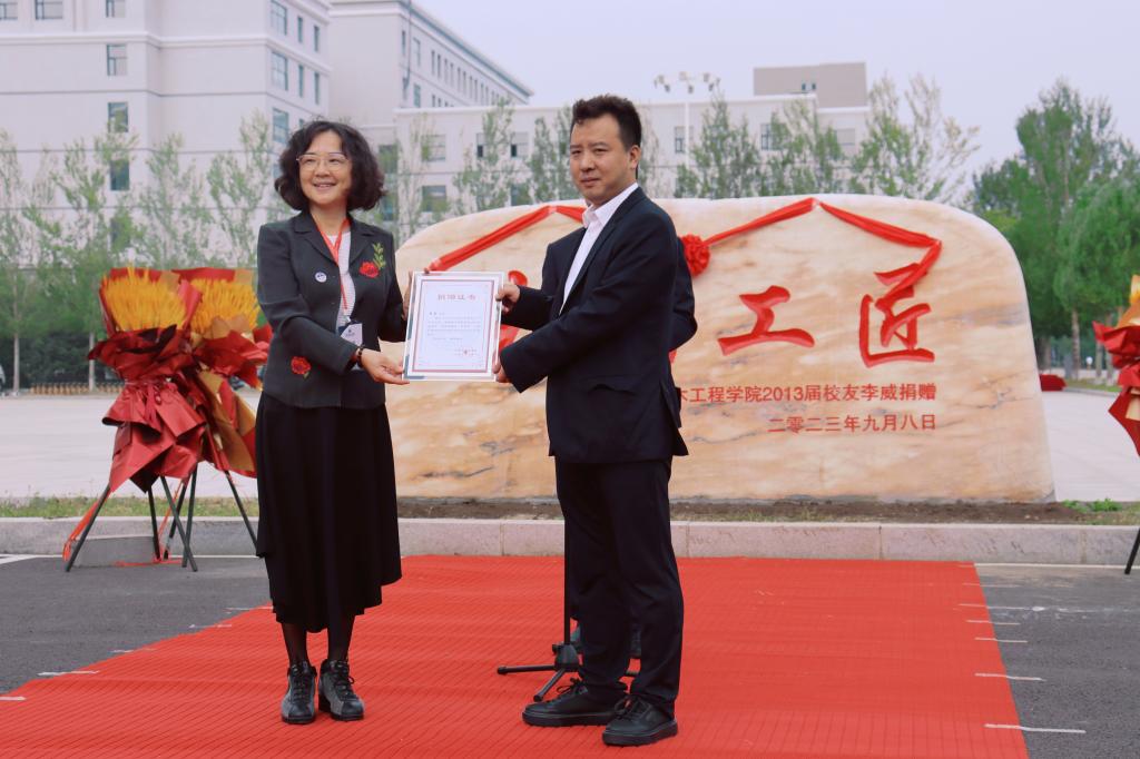 揭幕仪式后,校长柴维斯为校友李威颁发捐赠证书,并在“校庆石”前合影留念。
