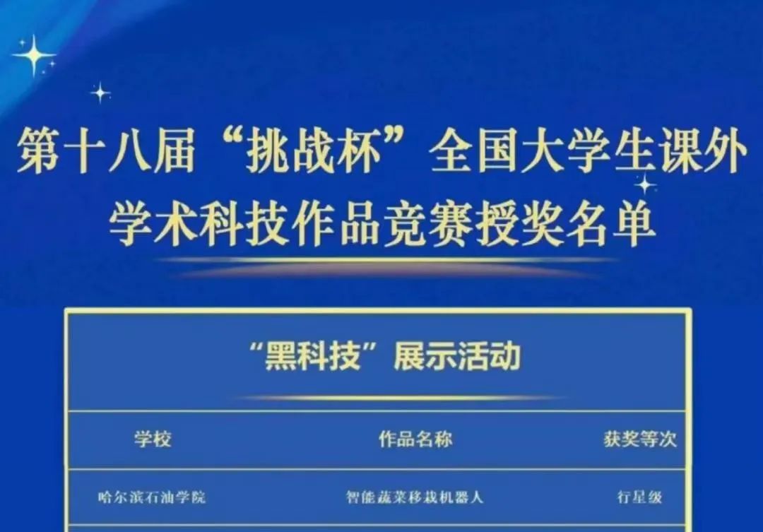 近日,第十八届“挑战杯”全国大学生课外学术科技作品竞赛授奖名单公布,冰球官网“智能蔬菜移栽机器人”项目,荣获行星级奖项(等同国家二等奖),获奖等级再创历史新高!