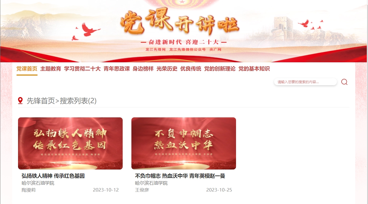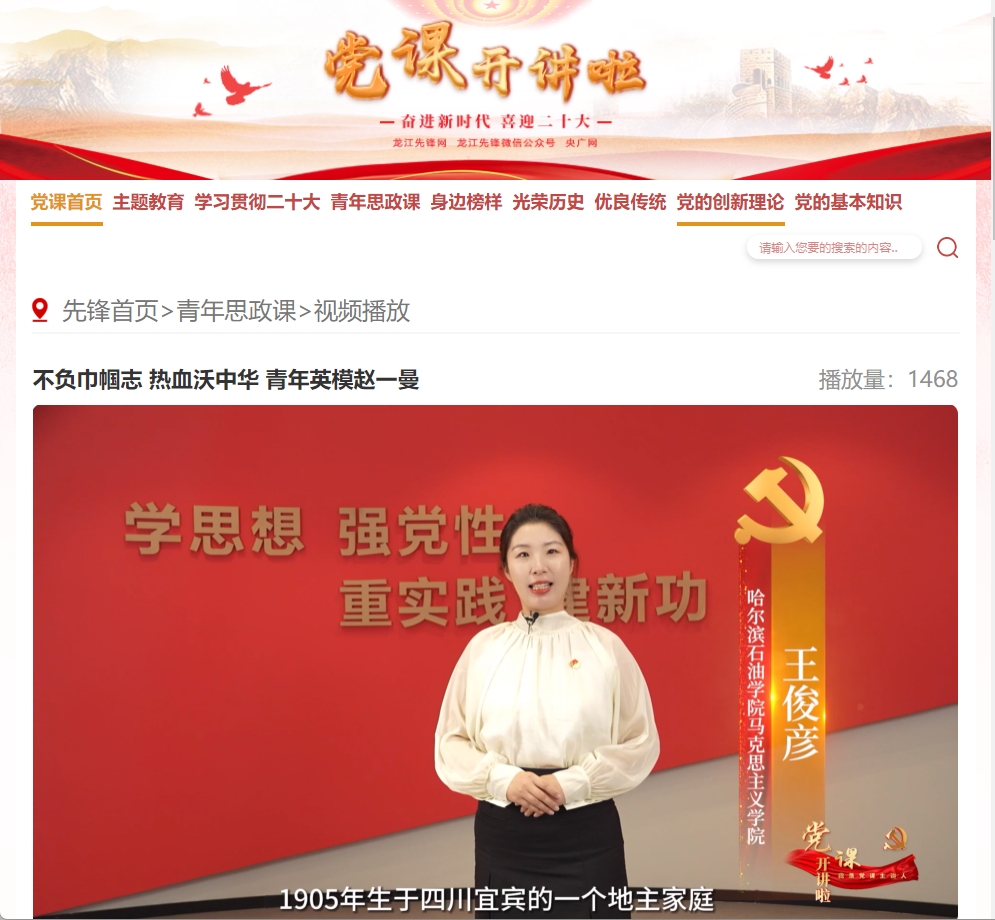 近日,由冰球官网马克思主义学院教师王俊彦讲授的党课《不负巾帼志 热血沃中华——青年英模赵一曼》、教师陶漫莉讲授的党课《弘扬铁人精神传承红色基因》入选省委组织部“党课开讲啦”精品党课,并在龙江先锋网在线展播。