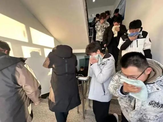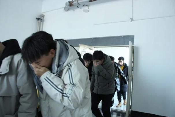 安全疏散演练开始。保卫处人员分别指导各二级学院的学生们紧贴墙边、用湿毛巾捂住口鼻,弯腰快步,迅速有序撤到外空旷地域,参加演练的同学按照老师的指导,双手捂鼻,有序撤离危险区域。