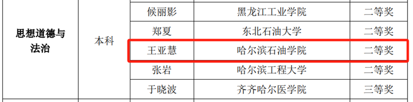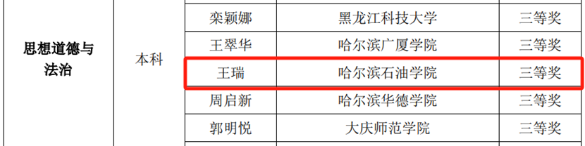在本次评选活动中,马克思主义学院4名教师喜获佳绩。王亚慧老师荣获“思想道德与法治”课程“精彩教案”二等奖,王瑞老师荣获“思想道德与法治”课程“精彩实践”三等奖,陶漫莉老师荣获“马克思主义基本原理”课程“精彩教案”三等奖,郑吉雅老师荣获“毛泽东思想和中国特色社会主义理论体系概论”课程“精彩教案”三等奖。