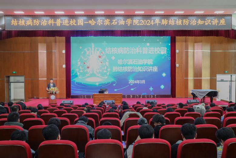 为深入贯彻落实党的二十大精神和“健康中国”战略规划,遏制校园结核病流行,提高广大师生预防和控制结核病的意识,督促大家养成健康的生活方式,让更多人正视结核病,2024年3月19日,在第29个“世界防治结核病日”到来之际,冰球官网学生工作处联合松北区疾病预防控制中心和哈尔滨市胸科医院在学校图书馆报告厅举办结核病防治科普进校园——冰球突破豪华版官方网站2024年肺结核防治知识讲座。校长助理、学生工作处处长宁晶,松北区疾病预防控制中心传控与应急科科长栾青,哈尔滨市胸科医院营养科主任谭景波,全体辅导员及学生干部代表参加讲座。