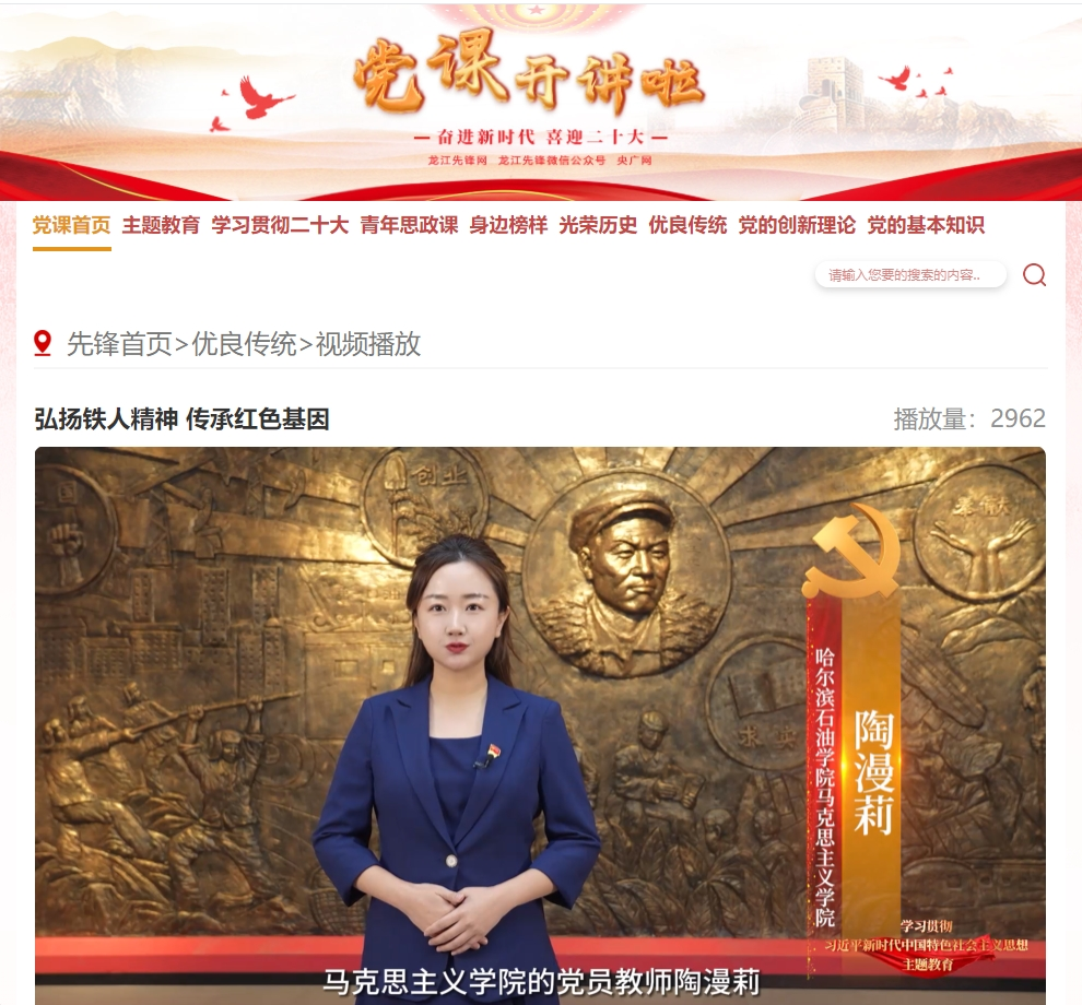 马克思主义学院教师陶漫莉讲授微党课《弘扬铁人精神 传承红色基因》在龙江先锋网展播,并荣获2023年度黑龙江省“党课开讲啦”活动精品党课三等奖