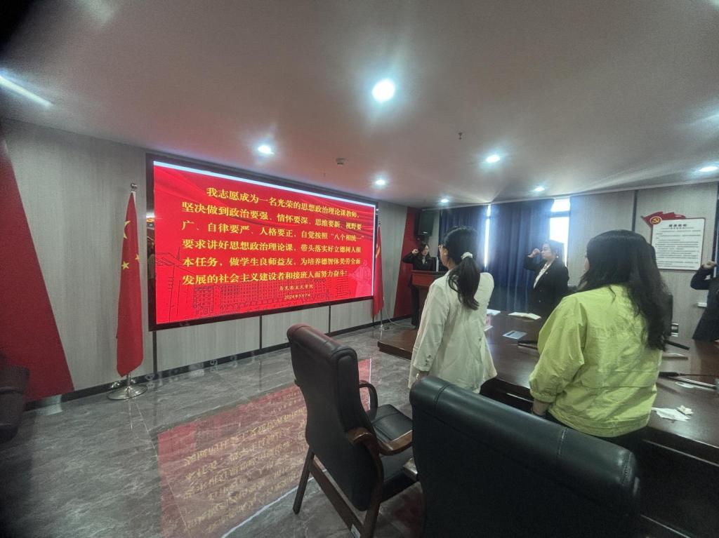 “我志愿成为一名光荣的思想政治理论课教师,坚决做到政治要强、情怀要深、思维要新、视野要广、自律要严、人格要正,自觉按照‘八个相统一’要求讲好思想政治理论课,带头落实好立德树人根本任务,做学生良师益友,为培养德智体美劳全面发展的社会主义建设者和接班人而努力奋斗!”在马克思主义学院副院长王瑞的领读下,全院教师紧握右手,郑重宣誓,并签订《师德师风承诺书》。每一句铮铮誓言和郑重承诺,都铿锵有力地表达了学院全体教师对提高自身师德修养、规范自身言行、争做新时代“四有”“六要”好教师的决心。