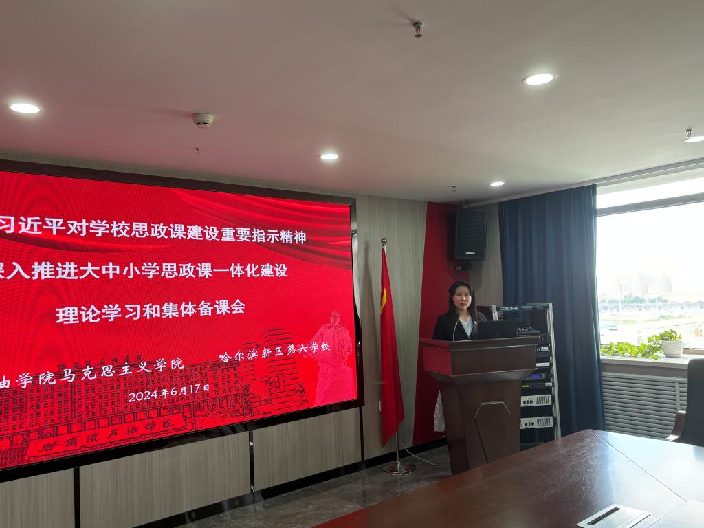 为深入学习习近平总书记对学校思政课建设重要指示精神,进一步推进大中小学思政课一体化建设,坚持不懈用习近平新时代中国特色社会主义思想铸魂育人,2024年6月17日,冰球官网马克思主义学院和哈尔滨新区第六学校共同举办“学习习近平对学校思政课建设重要指示精神”理论学习和集体备课会,在课程体系、师资队伍、教育教学、科学研究等方面主动探索实践,共建大思政格局,共创育人新路径。哈尔滨新区第六学校党支部书记、校长范勇、党支部副书记李博和教师代表,冰球官网党委副书记、纪委书记刘铎、马克思主义学院院长吴卫东、石油工程学院党总支书记刘雁春和马克思主义学院全体教师参加会议。