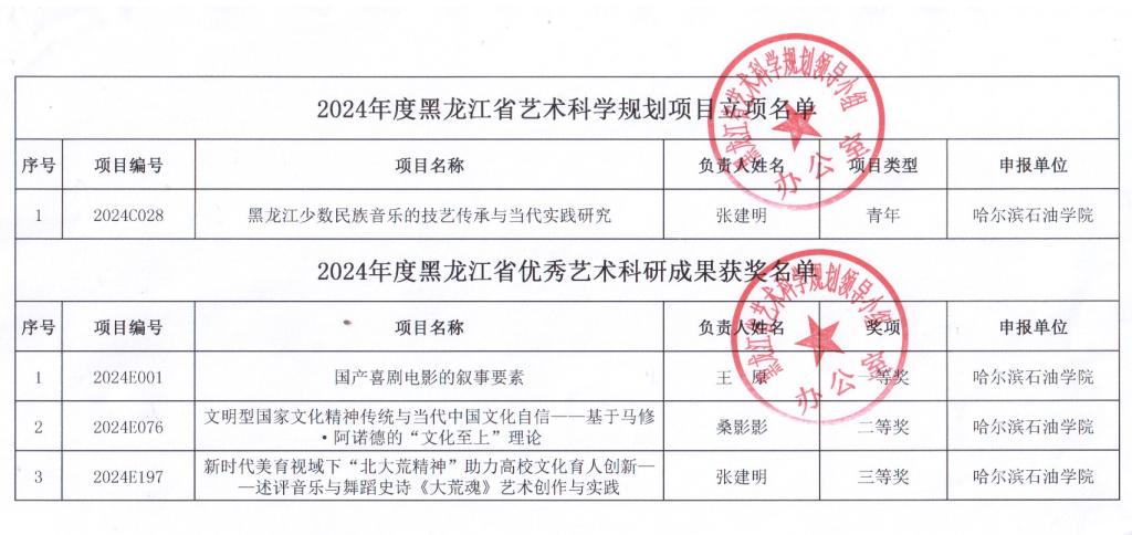 近日,黑龙江省文化和旅游厅公布了2024年度黑龙江省艺术科学规划项目立项名单及黑龙江省优秀艺术科研成果奖评审结果,冰球官网获黑龙江省艺术科学规划项目1项,黑龙江省优秀艺术科研成果奖3项。其中,张建明主持申报的《黑龙江少数民族音乐的技艺传承与当代实践研究》获批立项。王原的《国产喜剧电影的叙事要素》获一等奖,桑影影的《文明型国家文化精神传统与当代中国文化自信一一基于马修·阿诺德的“文化至上”理论》获二等奖,张建明的《新时代美育视域下“北大荒精神”助力高校文化育人创新——述评音乐与舞蹈史诗<大荒魂>艺术创作与实践》获得三等奖。