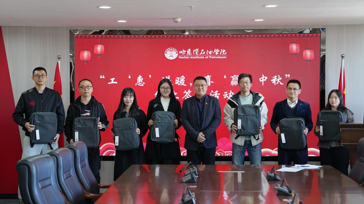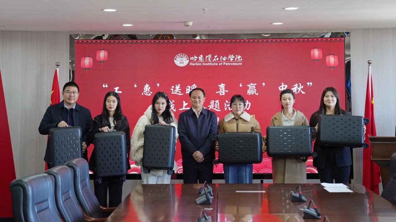 10月15日上午,学校工会在综合楼1414会议室举办“工‘惠’送暖,喜‘赢’中秋”线上答题活动颁奖仪式。党委书记林立民,副校长、工会主席康平军到场为获奖教职工颁发小米拉杆箱、小米双肩包等奖品。