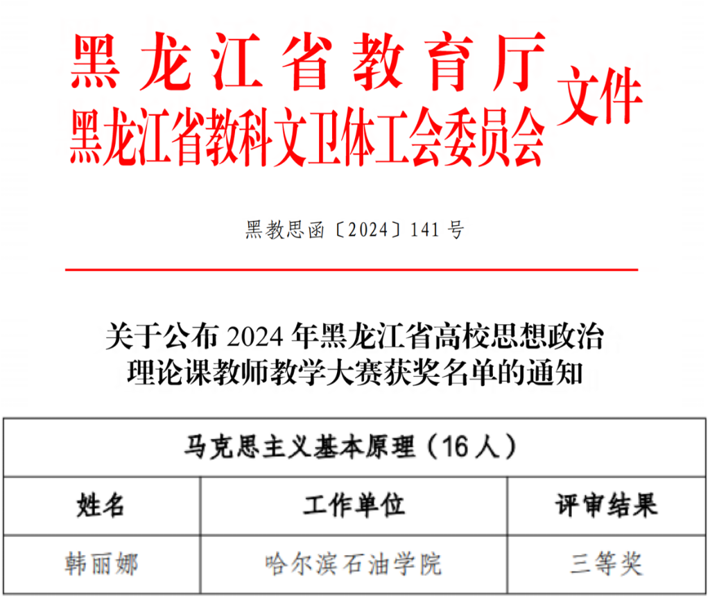 近日,黑龙江省教育厅、黑龙江省教科文卫体工作委员会公布了《2024年黑龙江省高校思想政治理论课教师教学大赛获奖名单》,冰球官网马克思主义学院青年教师韩丽娜获得本科组《马克思主义基本原理》课三等奖。