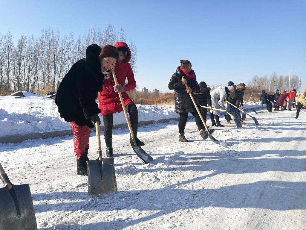 开学前夕,正值学生返校高峰,校园内来往车辆较多,很多路面积雪经过碾压,变成了又硬又滑的冰层,给通行带来了很大的隐患。冒着零下十几度的低温,教师们分成多个小组,男老师除冰,女老师扫雪,逐片开始清扫工作。严寒中,大家不断挥舞着手中的雪铲、铁锹、扫帚,积极行动起来。
