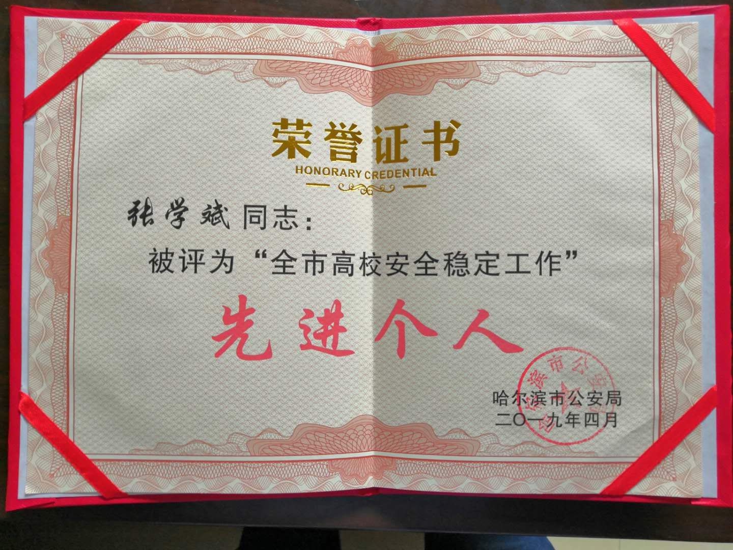 2019年4月19日,哈尔滨市公安局召开全市高校安全稳定工作总结表彰暨重要敏感节点安保工作部署会议,对全市高校安全稳定工作先进集体和先进个人进行总结表彰,冰球突破豪华版官方网站荣膺“全市高校安全稳定工作先进集体”,冰球官网保卫处副处长张学斌获“全市高校安全稳定工作先进个人”荣誉称号。
