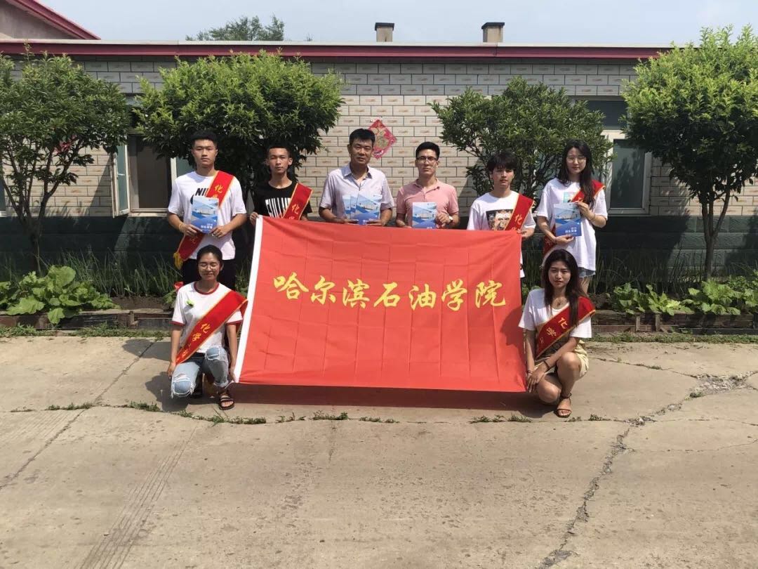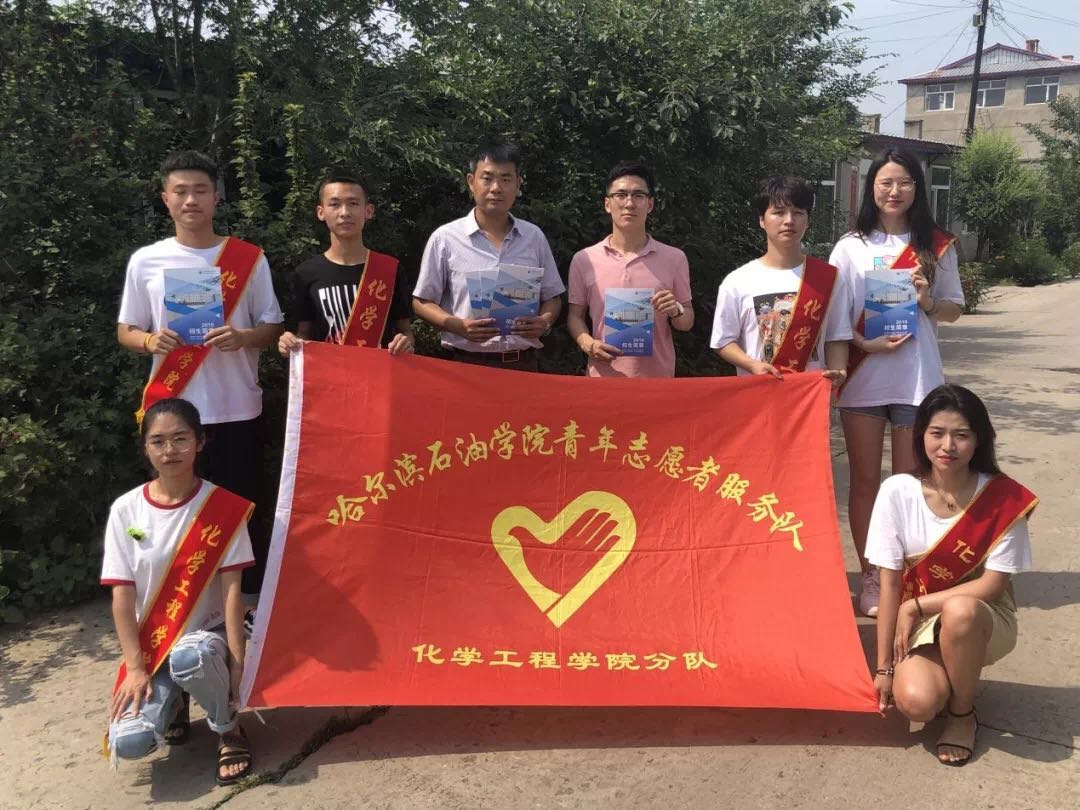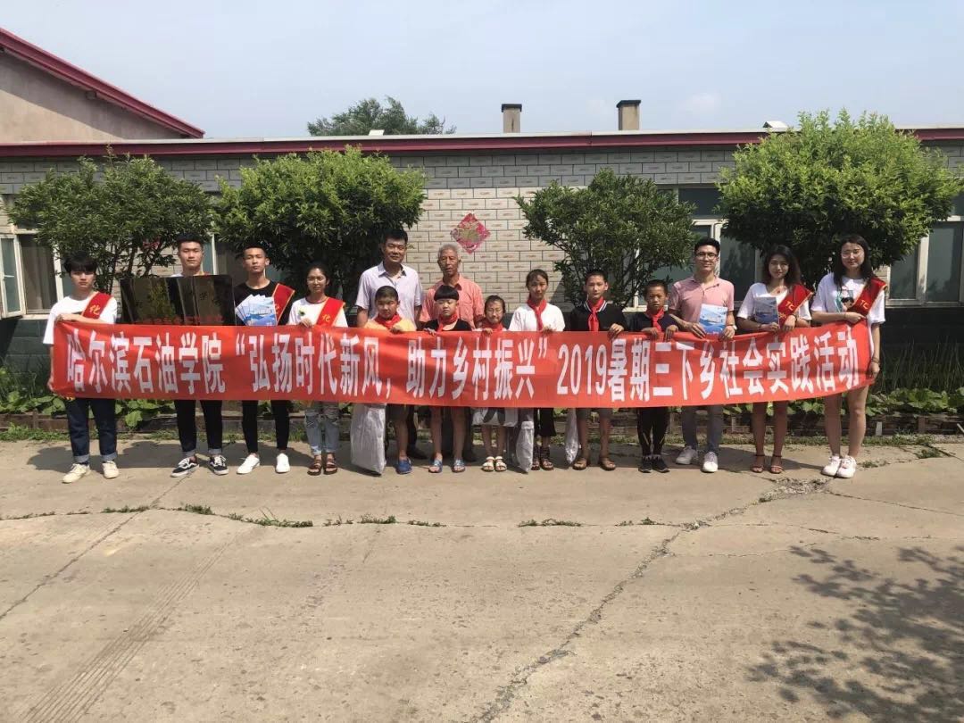 为进一步学习贯彻习近平新时代中国特色社会主义思想,进一步引领教育冰球官网青年学生勇做担当民族复兴大任的时代新人,以实际行动助力精准扶贫、服务乡村振兴战略,同时以庆祝中华人民共和国成立七十周年、五四运动100周年为契机,为全面坚持立德树人,努力培养社会主义合格建设者和可靠接班人做出积极贡献,根据 《冰球突破豪华版官方网站关于开展2019年大学生暑期社会实践的通知》(哈石油团发〔2019〕13号)文件要求,冰球官网化学工程学院志愿者服务队于2019年7月14日,在团总支书记李长城和辅导员姜雪峰的带领下一行九名志愿者,来到了哈尔滨市呼兰区裕田村,开展了以“弘扬时代新风,助力乡村振兴”为主题的"三下乡"社会实践活动。