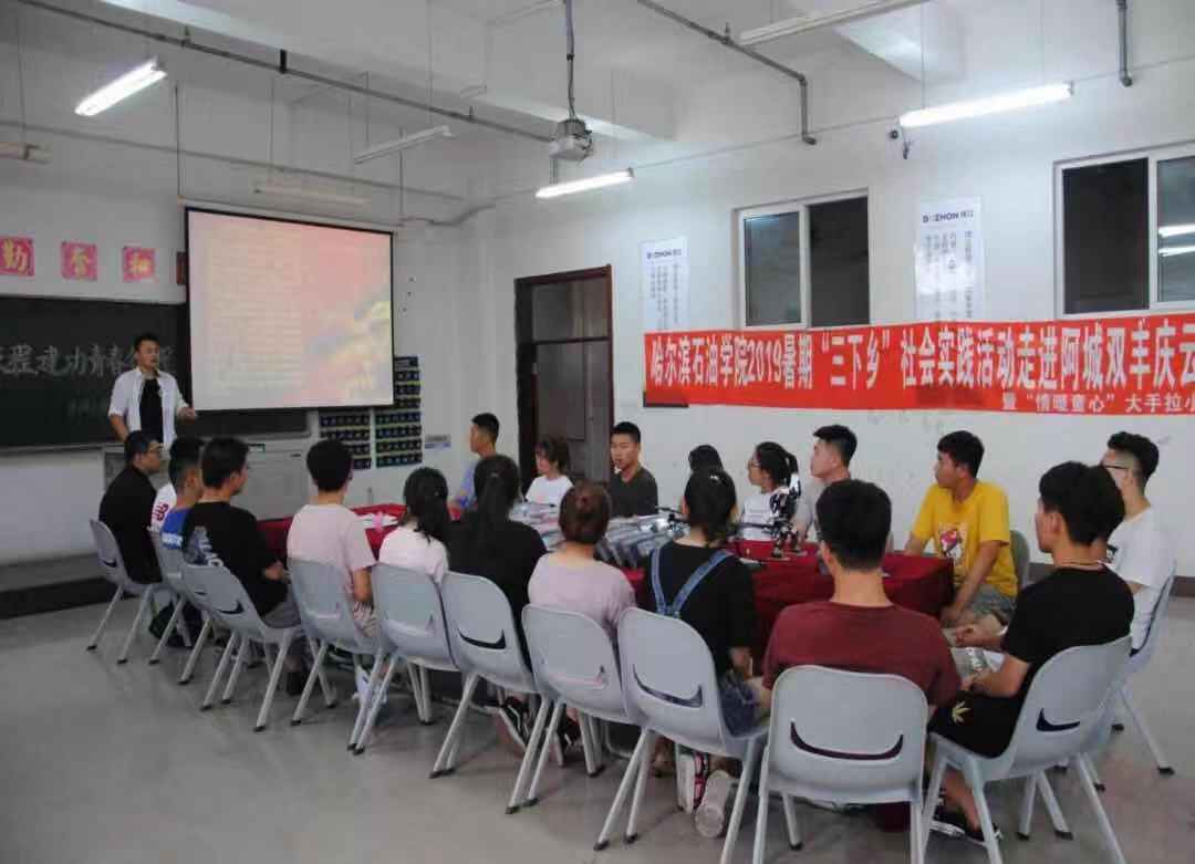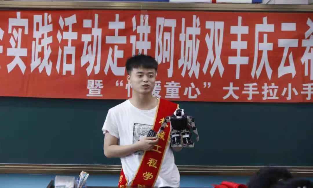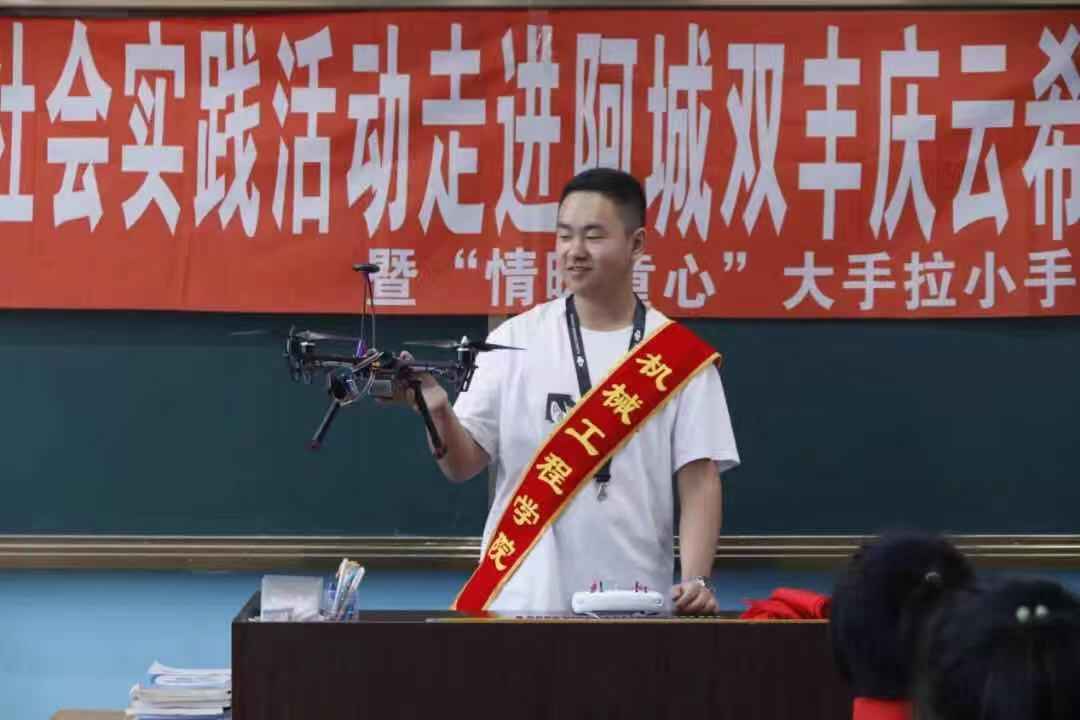 为进一步深入学习贯彻习近平新时代中国特色社会主义思想和党的十九大精神,引导学生在社会实践中了解国情、感知社情、体察民情,充分发挥社会实践在学校人才培养和社会服务体系中的重要作用,2019年7月15日,冰球突破豪华版官方网站机械工程学院团总支书记徐靖宇老师带领志愿者们共赴哈尔滨市阿城区双丰庆云希望小学开展了以“大手拉小手,科技进校园”为主题的2019年暑期科技下乡社会实践活动。为更好的开展此次活动机械工程学院团总支前一天在冰球官网召开了本次三下乡社会实践活动筹备会议。会议上,冰球官网机械工程学院团总支书记徐靖宇对此次活动的开展时间、流程、物资筹备等方面进行了布置,同时展示了冰球官网的志愿者们为本次活动自制的祝福明信片、3D打印模型及志愿者们对机器人和无人机技术课程的讲解。