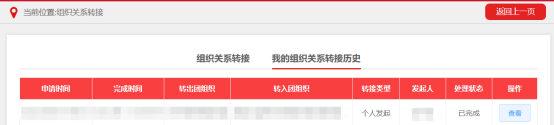 ③ 信息填写完毕确认无误后,点击提交后,至此,个人操作部分已完成,等待转出团委和转入团委审核同意,点击“我的团组织关系转接历史”,点击右侧“查看”即可查看转接进程。