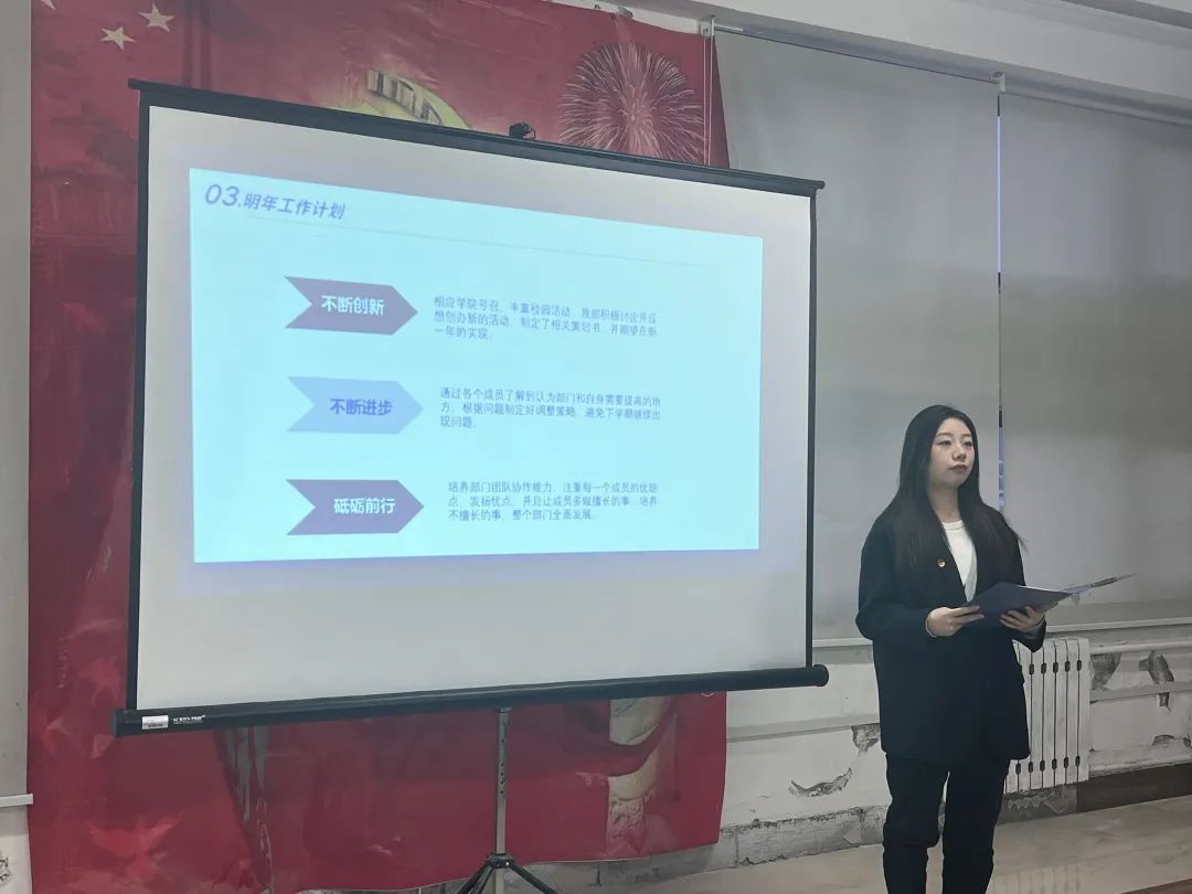 报告会开始,首先由学生联合会执行主席和各部门负责人围绕2023年度负责工作开展情况、存在的不足、汲取的经验、下一年度的工作计划及今后的发展方向等内容依次进行述职。随后,吴东爽书记对学生联合会的工作情况、组织能力及取得的成绩给予了高度的肯定,并指出学生联合会是师生沟通交流的纽带,应充分发挥其作用,增强责任使命担当。最后,邱晨明老师表示学生联合会成员应全面发展,在校园内各项活动中发光发热,为学院建设贡献自己的力量。