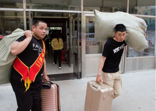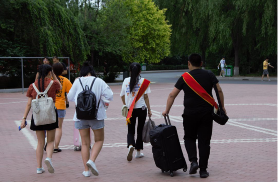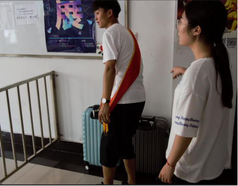 在炎炎夏日中,一个又一个的行李箱被搬到楼下,那些佩戴红色绶带的志愿者们穿梭在公寓楼中,直至公寓楼中只剩下志愿者们的身影。