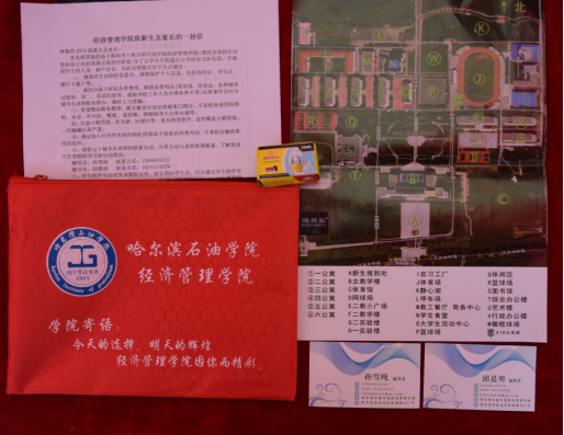 迎新时刻六:经济管理学院为2019级的新生准备了贴心“红包”,“红包”上面写着对新生的寄语以及画着经济管理学院的系标,“红包”的里面有校园云图、致家长的一封信、入学时间及军训时间安排表、辅导员联系卡和贴心的小锁头等。