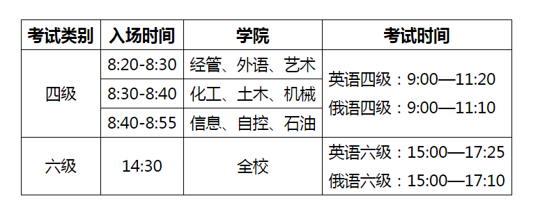 1.英语/俄语四级考试时间为2019年6月15日(星期六)上午,考生必须从8:20起进入教学楼接受安全检查。9:00后禁止考生进入主教学楼。具体时间见下表: