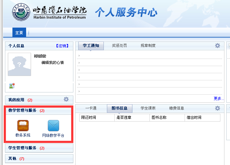 2、进入个人服务中心后,点开左侧“教学管理与服务”的下拉菜单中“教务系统”