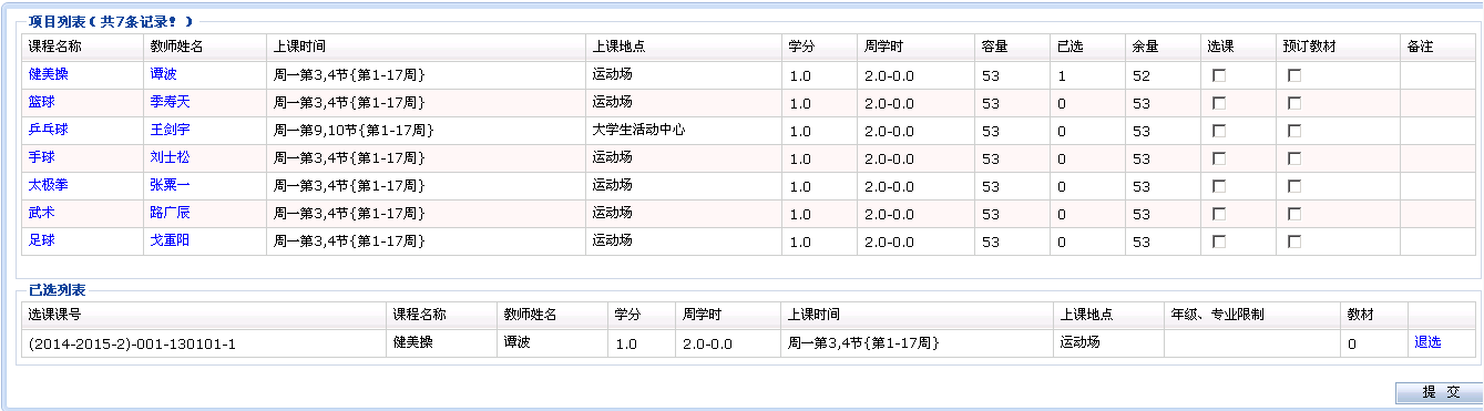 弹出板块下对应的体育项目信息,在对应项目后选课复选框选中后点“提交”按钮
