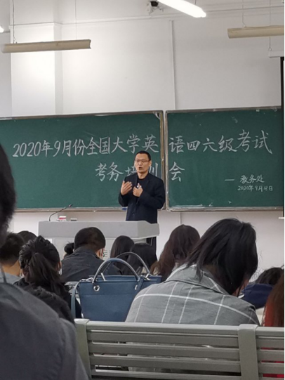 为确保所有涉考工作人员熟练掌握考务要求,保障2020年9月全国大学外语四、六级考试顺利进行,2020年9月18日下午,学校教务处组织召开监考教师考务培训会。教务处长张耘、副处长周微、教务处全体人员以及全体监考教师、考务人员参加了本次培训会议。