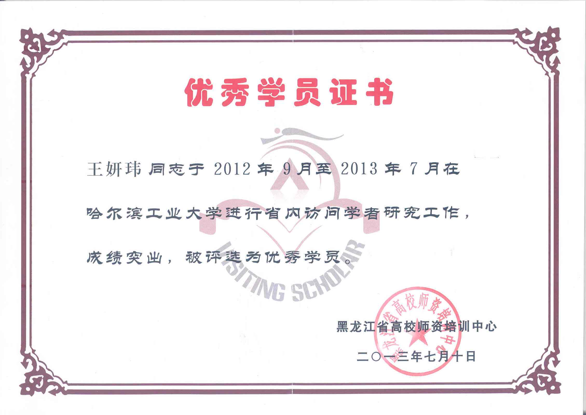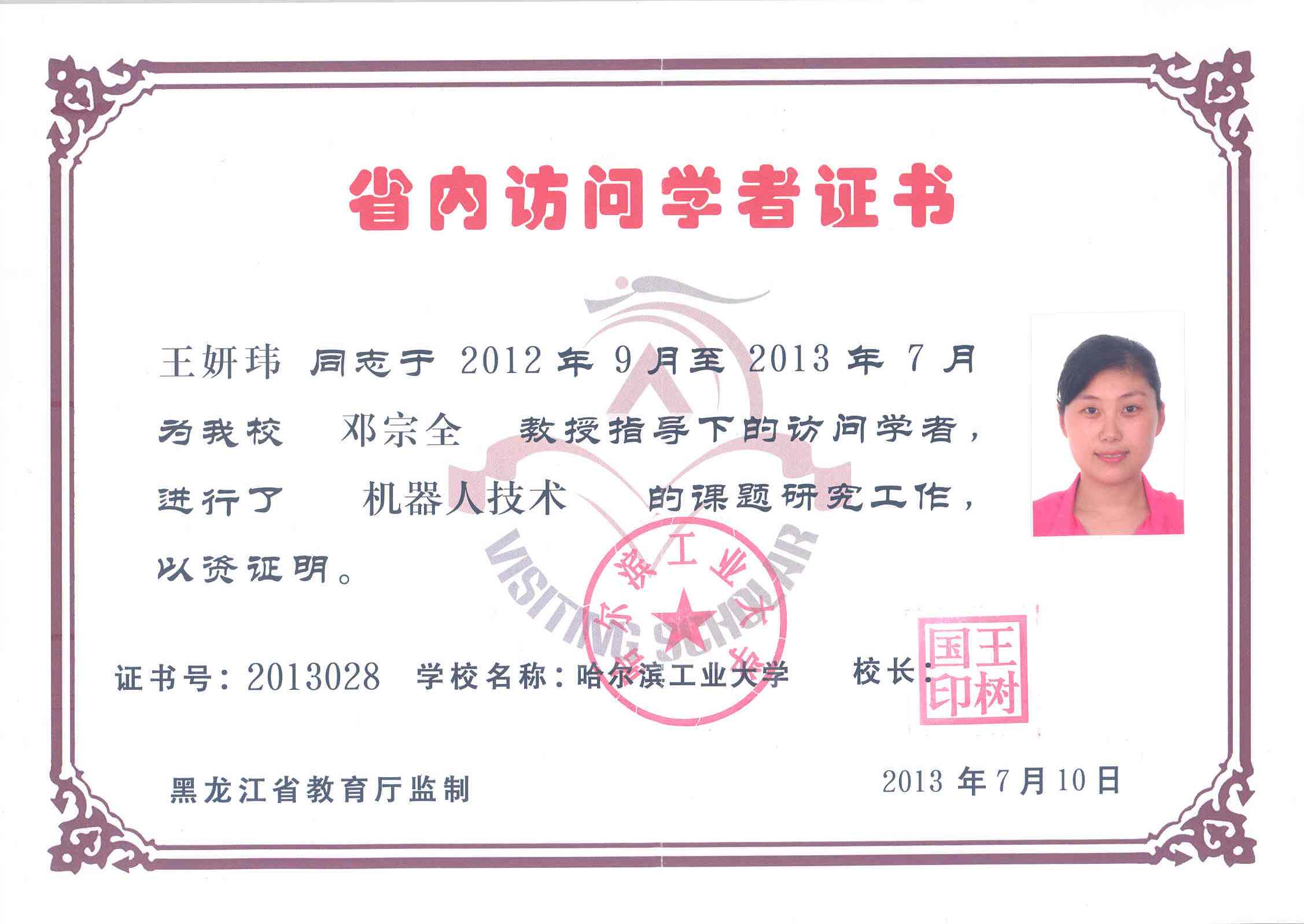2012年9月至2013年6月期间,冰球官网选派王妍玮、张春志作为“2012年黑龙江省高等学校青年骨干教师访问学者”赴哈尔滨工业大学进修,为冰球官网“机械电子工程”重点建设学科储备师资力量。经过一年的学习,达到哈尔滨工业大学访问学者的考核要求,顺利完成访学。其中,王妍玮教师获得优秀学员称号。