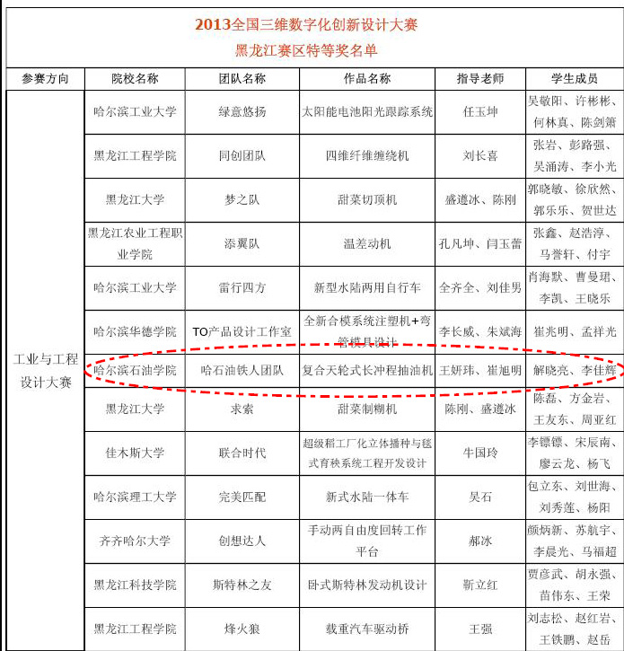 10月31日,由科技部高新司、教育部科技司、团中央学校部、国家制造业信息化培训中心等部门共同指导,国家制造业信息化培训中心3D办与3D动力网主办的“2013全国三维数字化创新设计大赛(3D大赛)”经网络公示投票、作品初评和复评后,黑龙江赛区的各奖项以及入选全国现场总决赛的团队名单揭晓。
