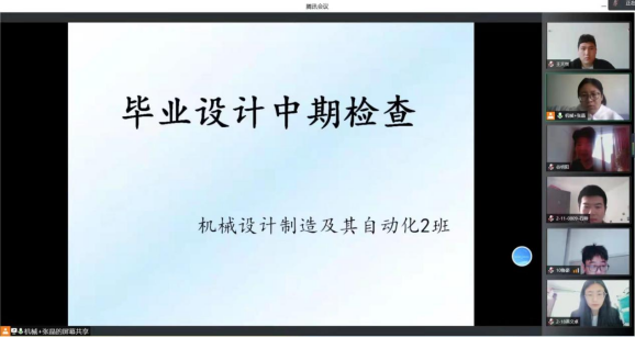 本次检查共分11个检查小组,34位教师和353位同学共同参加。每组分别建有检查微信群,并设有教师和学生的检查组长,便于学生和老师联系。此次线上检查工作采用腾讯会议直播平台,利用屏幕共享,每个学生按照规定的顺序依次进行线上PPT展示,主要从目前已完成的工作、遇到的问题与下一步的计划等方面进行汇报。检查组教师对学生的问题进行解答,对论文初稿和设计图纸进行初步检查。所有小组的中期检查均顺利完成。
